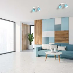 Oświetlenie sufitowe MLP7605 z kolekcji DIXIE, zostało zaprojektowane i wykonane przez polskiego producenta EKO-LIGHT. Klasyczna biel połączona z delikatnym błękitem z pewnością przyciągnie wzrok oraz świetnie będzie wyglądała w kolorowych pomieszczeniach, gdzie panują żywe barwy. 2 klosze w kształcie reflektorków, umożliwiają dowolnie modyfikowanie kąta padania światła. Lampa sufitowa mierzy 24cm szerokości i 14cm długości. Należy zaopatrzyć się w dwie żarówki LED o trzonku Gx53. W skład serii DIXIE wchodzi aż 40 modeli lamp w 4 tonacjach kolorystycznych - srebrnej, czarnej, błękitnej i różowej.