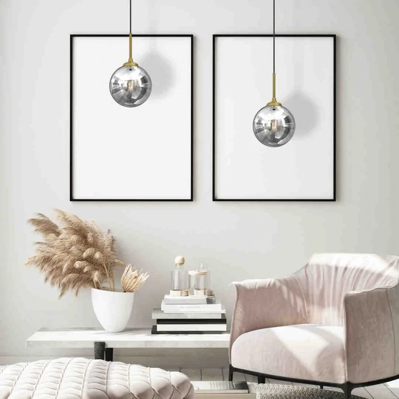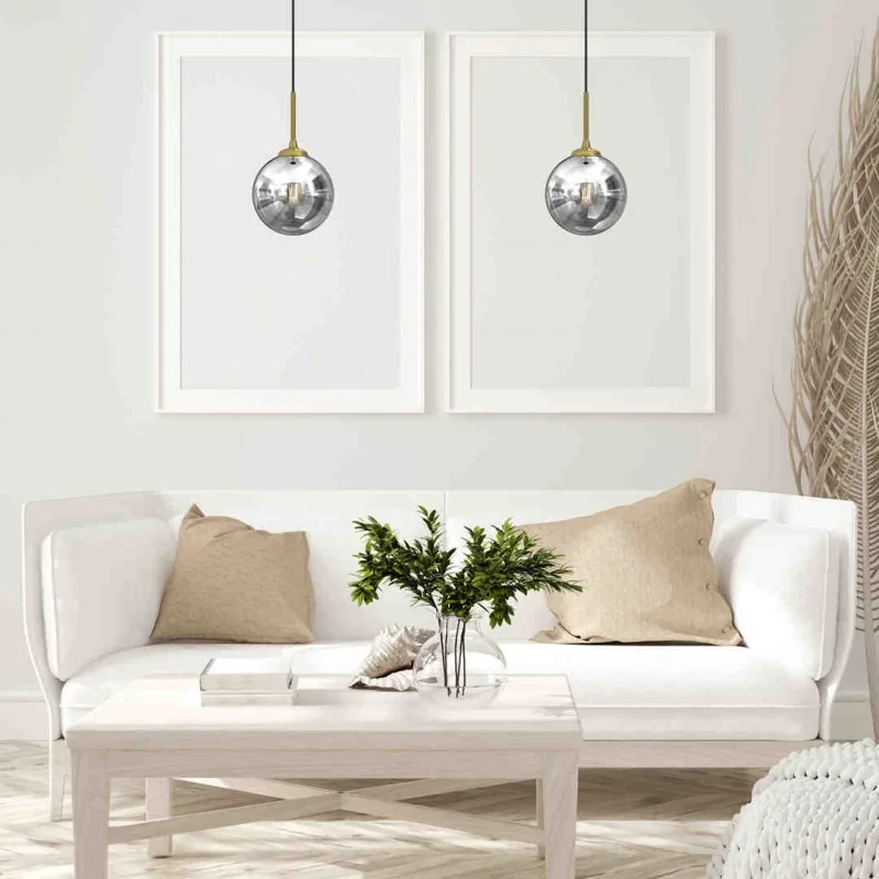 Lampa wisząca MLP8413 REFLEX marki EKO-LIGHT, wykonana w stylu glamour, pasuje do wnętrz klasycznych, ale z nutą nowoczesności. Samo mocowanie szklanej kuli ma akcent złotawy, co przełamuje szare i srebrne tony dominujące w kolorystyce lampy. Regulowana wysokość od 90 do 50cm (poprzez ucięcie przewodu), ułatwia dopasowanie do otoczenia oraz sprawia, że możemy stworzyć różne aranżacji. Wyjątkowym elementem jest klosz o efekcie dymienia o średnicy 17cm, który dopełniają złote akcenty zamontowane nadkloszówką. Oświetlenie wiszące przystosowane jest na żarówkę o trzonku E14 do max mocy 60W, brak w zestawie. Ten model dostępny jest także w rozmiarze 25cm, w formie kinkietów oraz potrójnej lampy.