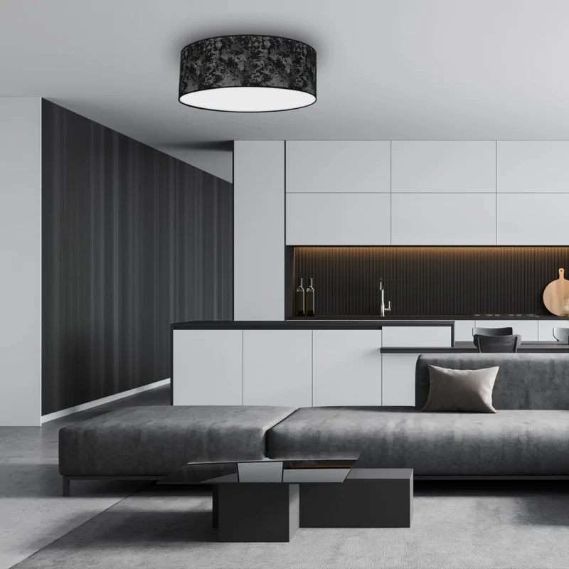 Największym atutem lampy sufitowej MLP7329 z kolekcji SATINO, jest prosty klosz, który pokryty został najwyższej jakości materiałem z niezwykle ciekawym połączeniem czerni ze srebrem, dzięki czemu prezentuje się nadzwyczaj elegancko. Wysokość oprawy to 13cm, natomiast średnica wynosi 50cm. Klosz wykonany jest z tkaniny, dzięki czemu przyjemnie rozprasza światło w pomieszczeniu oraz dla usztywnienia konstrukcji wyposażony jest w metalowe elementy. Jest to oświetlenie stworzone przez polska markę EKO-LIGHT, które posiada miejsce na 3 żarówki o tradycyjnym trzonku E27 (brak w zestawie). Polecamy do komplet wybrać inne lampy z serii SATINO, a jest do wyboru 10 modeli.