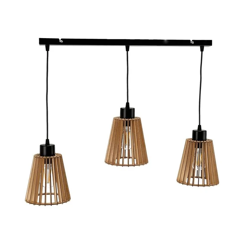 Lampa sufitowa z kolekcji DELOS, marki ORNO, świetnie sprawdzi się jako główne oświetlenie wnętrza. Z czarnej listwy zwisają 3 drewniane klosze o oryginalnej konstrukcji, które świetnie będą wyglądały we wnętrzach, gdzie króluje roślinność i naturalne dodatki, typu kamień lub drewno. W oświetleniu wiszącym należy zamontować trzy źródła światła o gwincie E27 do max mocy 60W. Polecamy wybrać dekoracyjną żarówkę np. w stylu vintage. Listwa mierzy 60cm wysokości, natomiast wysokość wynosi 76cm. Możemy skrócić przewód zasilający, dzięki czemu odpowiednio dopasuje wysokość kloszy do otoczenia i stworzymy własną konstrukcję. Polecamy zapoznać się z całą serią DELOS.