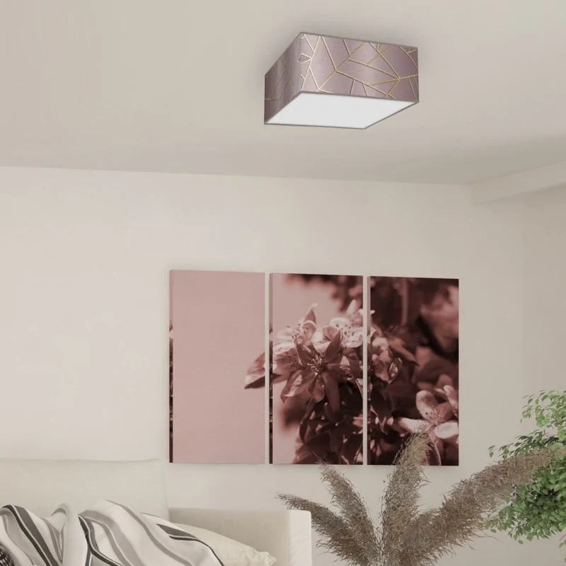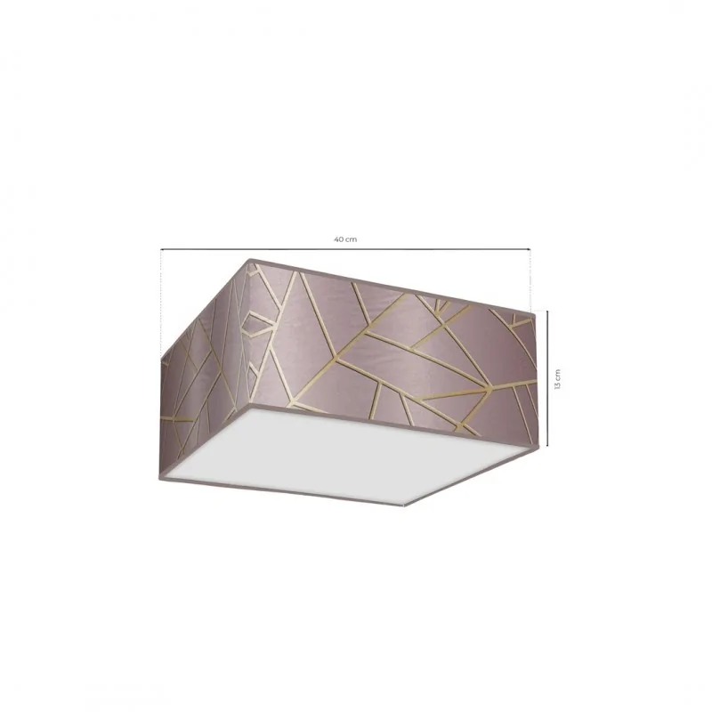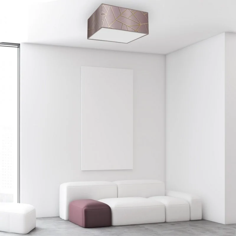 Oryginalne oświetlenie sufitowe ZIGGY MLP7588 polskiej marki EKO-LIGHT, to nietuzinkowe połączenie kolorystyczne z mało spotykanym kwadratowym kształtem. Różowy tkaninowy klosz ozdobiony jest złotymi geometrycznymi liniami oraz usztywniony metalowymi elementami, dzięki czemu konstrukcja jest stabilna i łatwa w montażu. Lampa przystosowana jest na tradycyjne dwie żarówki o gwincie E27 do max mocy 60W. Jej szerokość jest równa 40cm, a wysokość wynosi 13cm. Zestawiając ze sobą kinkiety, lampkę stołową lub podłogową z tej serii stworzymy niepowtarzalny style we wnętrzu. W linii ZIGGY dostępnych jest aż 30 różnych lamp w kolorze białym, zielonym i różowym.
