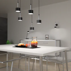 Duża lampa wisząca ARENA MLP7787, wykonana z metalu posłuży nam przez długie lata, dzięki solidnej oraz ponadczasowej konstrukcji. Surowy czarny kolor przełamany jest chromowymi dodatkami, dzięki takiemu połączeniu dopasujemy ją do każdego pomieszczenia. Ułatwia to również regulowana wysokość poprzez skrócenie przewodu - od 30 do 90cm. Średnica podstawy to 44cm, natomiast szerokość klosz wynosi 8cm. Oświetlenie producenta EKO-LIGHT, przystosowana jest na 5 żarówek o gwincie Gx53 (brak w zestawie). Mamy szeroki wybór tego typu oświetlenia, ponieważ seria ARENA składa się z aż 36 różnych lamp.