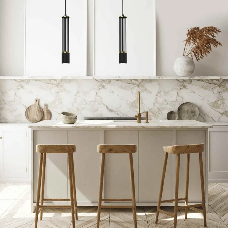 Lampa wisząca ESTILO MLP8409 marki EKO-LIGHT, mimo swojej minimalistycznej nieco surowej formy doskonale kreuje przytulną, klimatyczną aurę we wnętrzu. Sama oprawa choć czarna, nie tworzy przytłaczającego, ciężkiego efektu, wszystko za sprawą drucianej tuby, o oryginalnie wyglądających prześwitach oraz delikatnych złotych dodatkach. Oświetlenie wiszące bez problemu dopasuje się do każdej przestrzeni, dzięki możliwości regulowania wysokości od 90 do 40 cm (poprzez ucięcie przewodu). Lampa przystosowana jest na żarówkę o gwincie GU10 do max mocy 40W - brak w zestawie. W serii ESTILO znajdują się 3 modele lamp.