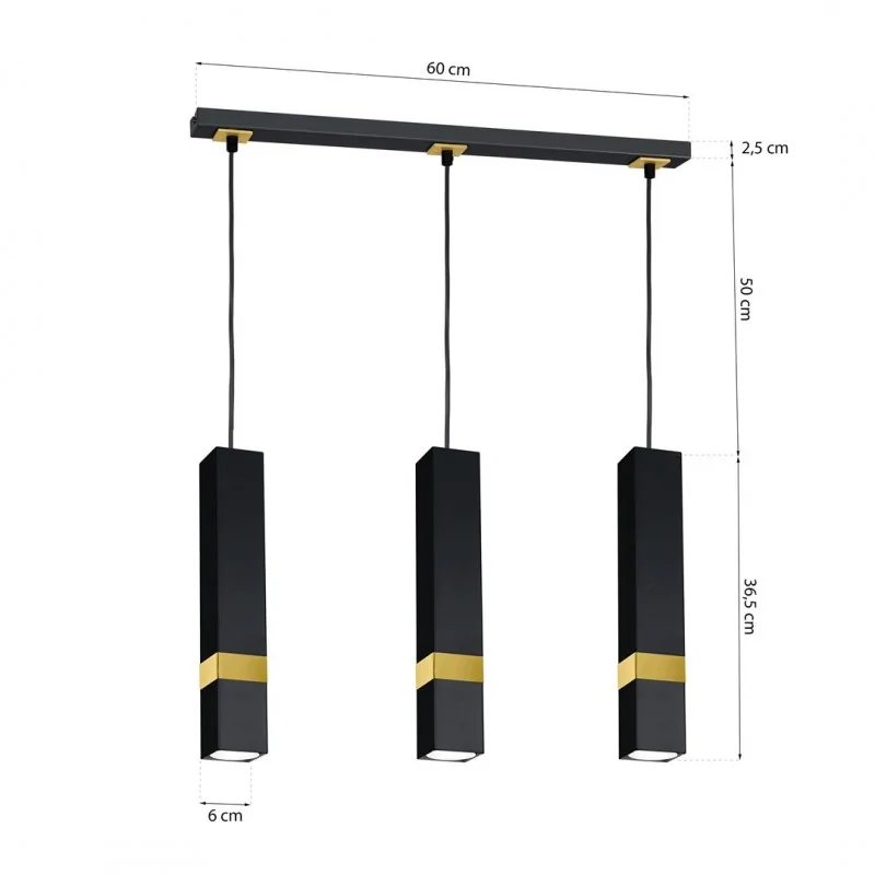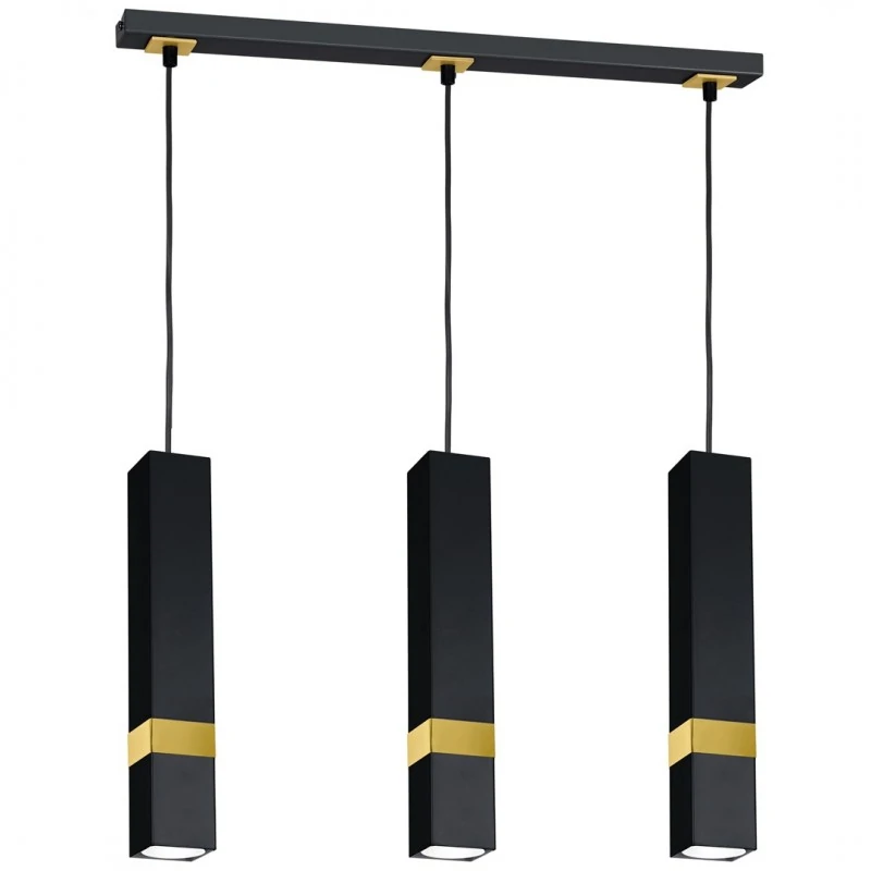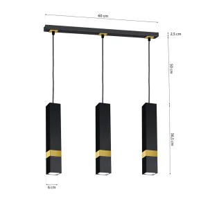 Lampa sufitowa Vidar w kolorze czarnym ze zlotymi zdobieniami to eleganckie oświetlenie do salonu, jak również recepcji w hotelu lub nowoczesnej restauracji. Produkt wyposażony został w trzy klosze w kształcie prostopadłościanu. Brak źródła światła w zestawie sprawia, że możesz samodzielnie dopasować odpowiednią żarówkę dla siebie. Linia Vidar obejmuje nowoczesne lampy sufitowe, ścienne, lampki nocne oraz podłogowe. Dedykowanym źrodłem światla jest żarówka z trzonkiem GU10.
