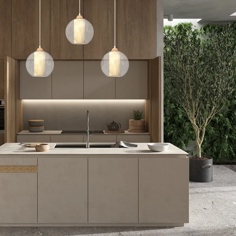 Lampa wisząca TELA MLP7957 marki EKO-LIGHT, w stylu EKO, będzie świetnie komponowała się z delikatnymi kolorami np. beżowym lub kremowym. Wewnętrzny klosz wykonany został z drewna, natomiast okrągła kula jest ze szkła i jej średnica wynosi 20cm. Całość została zawieszona na metalowych linkach, które umożliwiają regulację wysokości od 50 do 90 cm. Oświetlenie przystosowane jest na 3 żarówki o tradycyjnym trzonku E27 (brak w zestawie). Rodzina lamp TELA składa się z kinkietu oraz 3 lamp wiszących z jednym i 3 źródłami światła. Wprowadzając do naszych domów i mieszkań lampy TELA, wprowadzimy tym samym do nich harmonię.