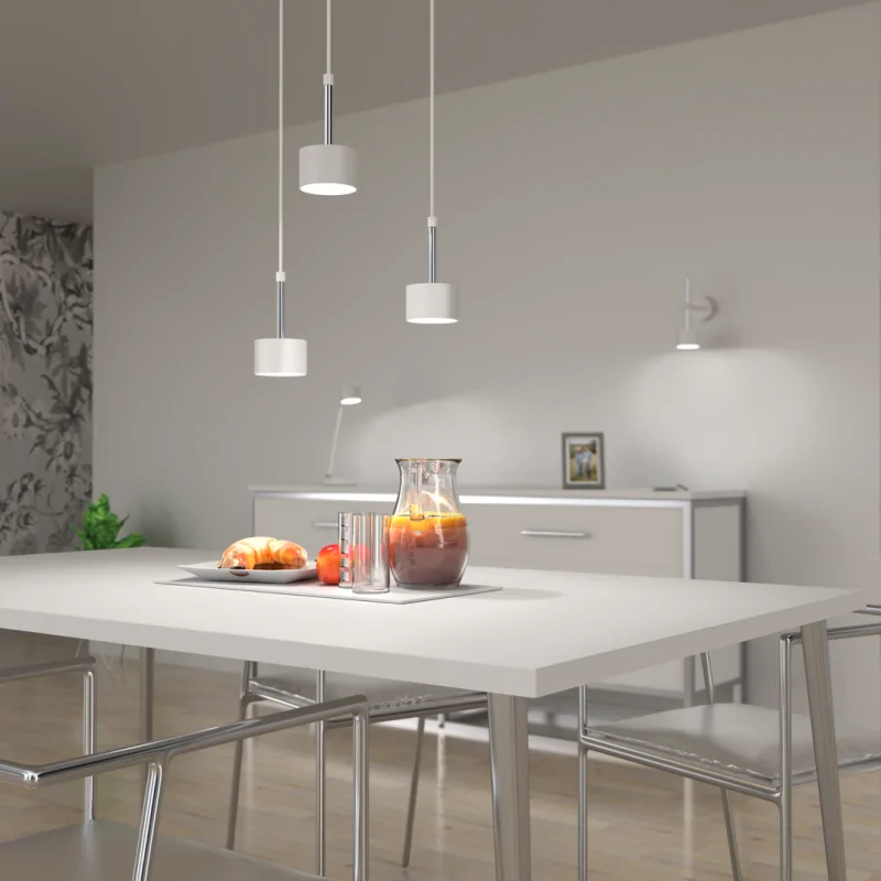Lampę wisząca ARENA MLP7780, możemy wykorzystać zarówno nad stołem kuchennym, w salonie czy pomieszczeniach restauracyjnych lub biurowych. Regulowana wysokość kloszy (od 30 do 90 cm), poprzez skrócenie linek, ułatwia dopasowanie do otoczenia oraz pozwala na stworzenie aranżacji według własnej wizji. Oświetlenie wykonane jest w całość z metalu w kolorze delikatnej bieli oraz stylowych chromowych elementów. Lampa to propozycja producenta EKO-LIGHT, która przystosowana została na 3 żarówki Gx53 - brak w zestawie. Średnica oprawy wynosi 30cm, natomiast klosze mierzą 8cm. Polecamy zapoznać się z całą rozbudowaną serią ARENA.