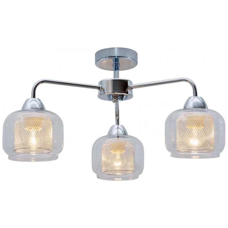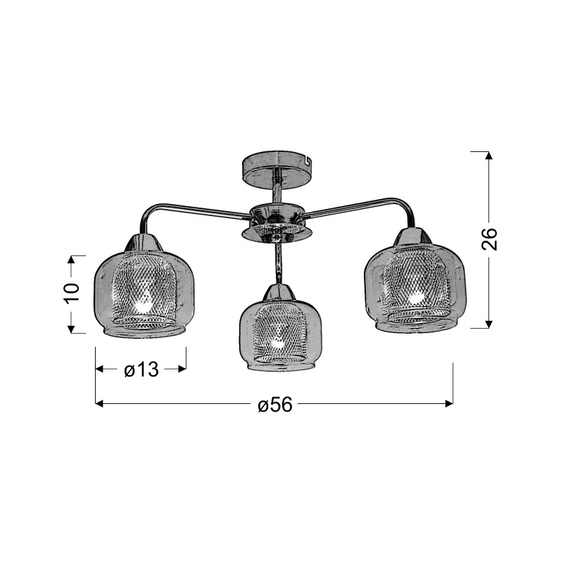 Lampa sufitowa RAY 33-67081 wykonana z podstawy metalowej w kolorze chromowym oraz ramion skierowanych ku dołowi, zakończonymi podwójnymi kloszami. Zewnętrzny abażur jest szklany, transparentny a wewnętrzny wykonany z metalu w formie siatki. Klosz pełni podwójną funkcję - dekoracyjną oraz użytkową - zapewnia maksymalne doświetlenie pomieszczenia. Lampa wisząca marki Candellux przystosowana jest do trzech źródeł światła o gwincie E27, max mocy 40W. Idealnie wpasuje się w styl zarówno nowoczesnego jak i do klasycznego salonu, pokoju dziennego, kuchni, ze szczególnym uwzględnieniem pomieszczeń niskich. Do kompletu polecany jest kinkiet 1 ramienny oraz lampa wisząca 5 ramienna. Produkt objęty jest gwarancją producenta.