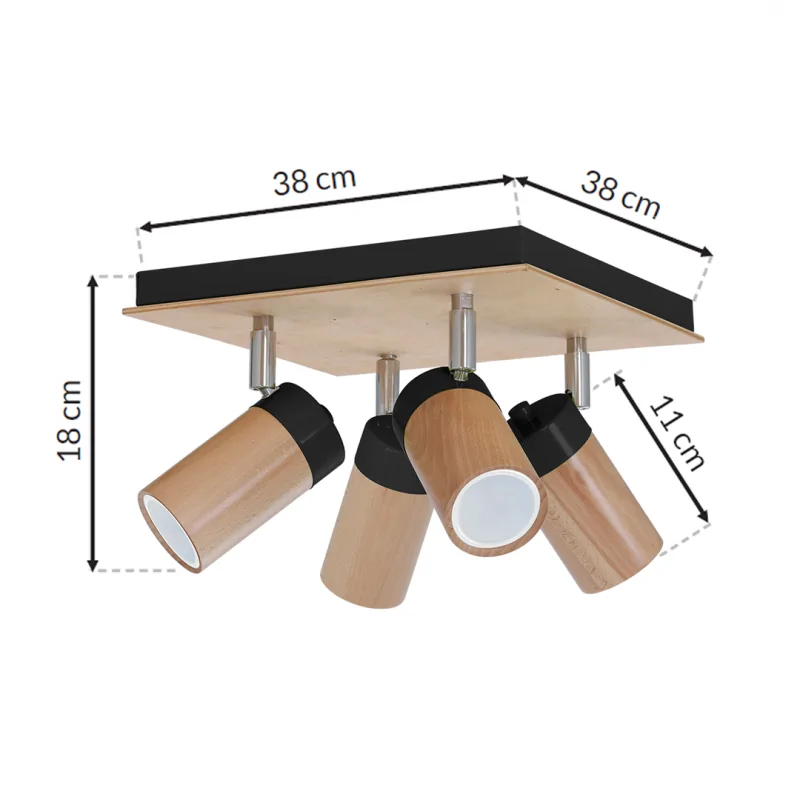 Lampa sufitowa poczwórna BARON marki EKO-LIGHT to spot oświetleniowy wyposażony w 4 ruchome klosze w kształcie walca. Prezentowany model lampy posiada drewnianą obudowę z dodatkiem metalowego materiału w kolorze czarnym. Lampa sufitowa przeznaczona jest do pracy z czterema żarówkami z trzonkiem GU10 (brak w zestawie). Dzięki ruchomym kloszom możesz skierować światło w dowolnie wybrany punkt. Dodatkowo brak źródła światła w zestawie sprawia, że możesz indywidualnie dopasować moc, barwę oraz natężenie żarówki do własnych potrzeb oraz pomieszczenia. Wymiary lampy to: 38x38x18cm.