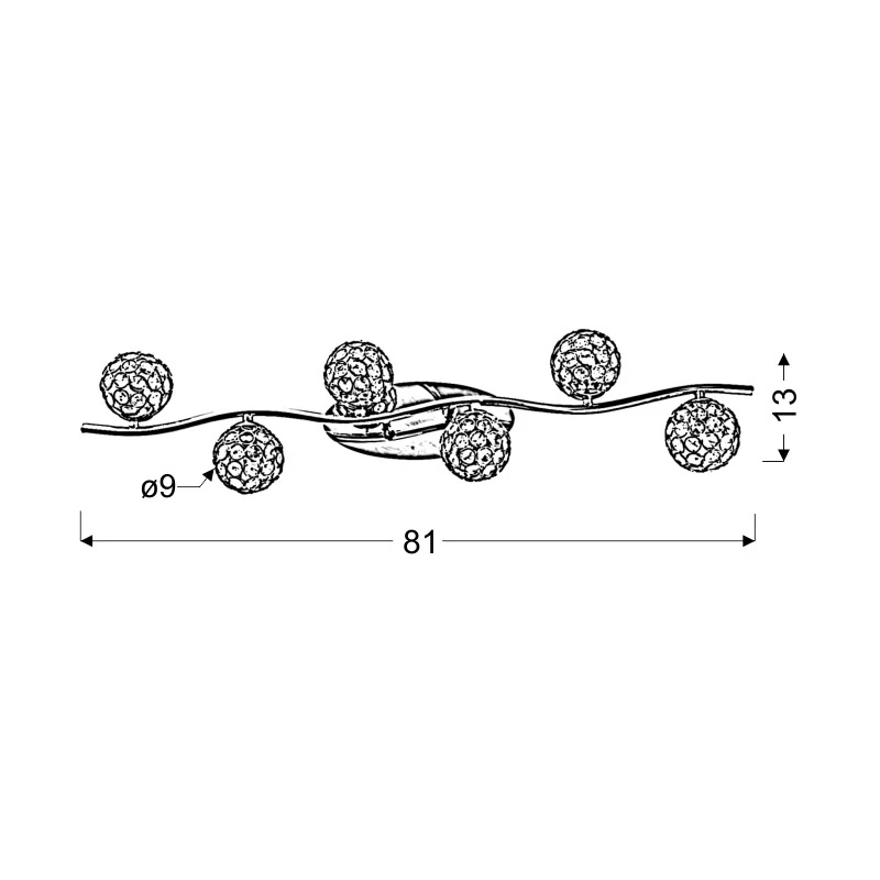 Elegancka lampa sufitowa STARLET 96-85941, w stylu glamour roztacza w pomieszczeniu przyjemny i ciekawy klimat a to za sprawą kloszy, które są stworzone z kryształków. Lustrzana podstawa wykonana z metalu odbija światło a transparentne abażury nie ograniczają przepływu strumienia światła, dzięki czemu poradzi sobie w ciemnych pomieszczeniach. Oświetlenie posiada miejsce na aż sześć źródeł światła i przystosowana jest na gwint G9 do maksymalnej mocy 40W. Spore wymiary lampy to: wysokość 13cm i szerokość 81cm. W tej linii są również lampy wiszące, kinkiety i plafony. Produkt objęty jest gwarancją producenta.