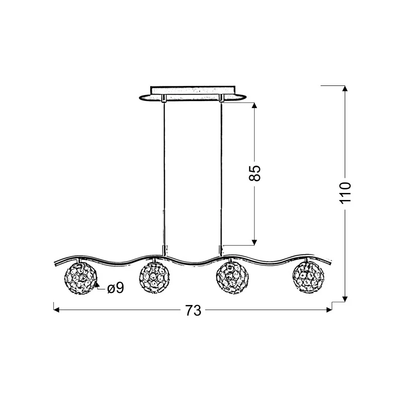 Wisząca lampa STARLET 34-85750, wyposażona jest w klosze wykonane z kryształków, które pięknie połyskują ale również dzięki transparentności nie ograniczają przepływu strumienia światła. Całość wykonana jest z metalu i zawieszona na linkach, którymi możemy regulować wysokość, poprzez skrócenie przewodów. Doskonale rozświetli wnętrze salonu, sypialni czy też pomieszczeń biurowych lub restauracyjnych. Lampa sufitowa przystosowane jest na cztery źródła światła o trzonku G9 i do maksymalnej mocy 40W. Posiada wymiary takie jak: wysokość 110 cm i szerokość 73cm oraz należy do klasy energetycznej A++, A+ i A. W tej linii znajdziemy kinkiety, plafony i podobne lampy wiszące. Produkt objęty jest gwarancją producenta.