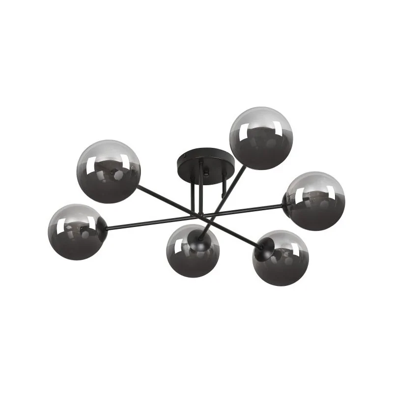 Nowoczesna lampa sufitowa z kolekcji BARI marki ORNO, wyprodukowana została w Polsce, dzięki oryginalnej konstrukcji maksymalnie oraz efektowanie rozprasza światło. Składa się z sześciu kulistych kloszy, wykonanych ze szkła w odcieniu grafitowym. Lampa ma bardzo charakterystyczną, wręcz futurystyczną formę i będzie wyraźnym akcentem nowoczesności we wnętrzach. Oświetlenie sufitowe przystosowane zostało na 6 żarówek o gwincie E14 do max mocy 40W - brak w zestawie. Oprawa mierzy 75cm szerokości i 26cm wysokości. Produkt przystosowany do montażu natynkowego w pomieszczeniach suchych. Seria BARI, składa się z lamp o równej konstrukcji i kolorystyce.