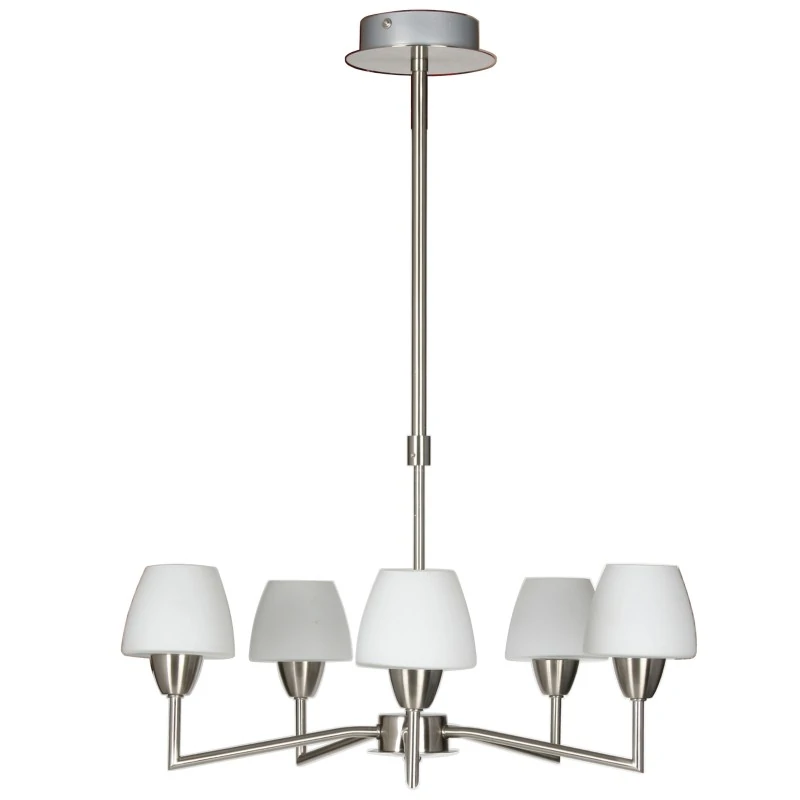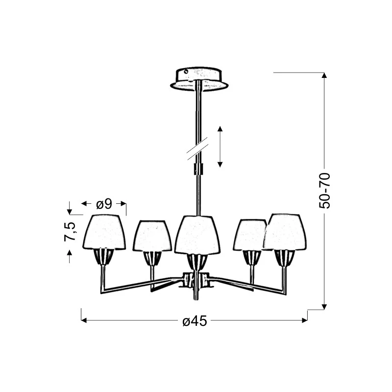 Pięciopunktowy żyrandol TOGO 35-10646 marki Candellux, został wykonany w kolorze delikatnej satyny w połączeniu z białymi kloszami, całość z pewnością nada pomieszczeniu sterylności i nowoczesnego akcentu. Prosta podstawa została przełamana ramionkami, które są oryginalnie powyginane. Lampa wisząca przystosowana jest na 5 żarówek o gwincie G9 do max mocy 40W - brak w zestawie. Wymiary oświetlenia wynoszą: wysokość - 70cm oraz szerokość/długość - 45cm. Do kompletu polecamy trzyramienną lampę wiszącą i kinkiet. Produkt objęty jest gwarancją producenta.