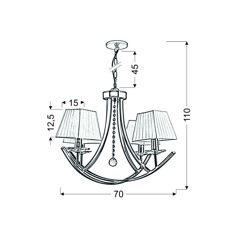 Wyszukany design lampy wiszącej VALENCIA 34-84555, charakteryzuje się ekskluzywnym połączeniem metalu, szkła i tkaniny. Ramionka w kolorze patynowym zakończone są klasycznymi abażurami, a całość dopełniają kryształki oraz szklane elementy. Zawieszona jest na wytrzymałych łańcuchach, które umożliwiają regulację wysokość. Oświetlenie sufitowe marki Candellux przystosowane jest na cztery źródła światła o gwincie E27 i maksymalnej mocy 40W (brak w zestawie). Doskonale sprawdzi się w salach restauracyjnych, wnętrzach hotelowych oraz pomieszczeniach domowych. W serii VALENCIA znajdziemy kilkupunktowe lampy wiszące, kinkiety oraz lampki gabinetowe. Produkt objęty jest gwarancją producenta.