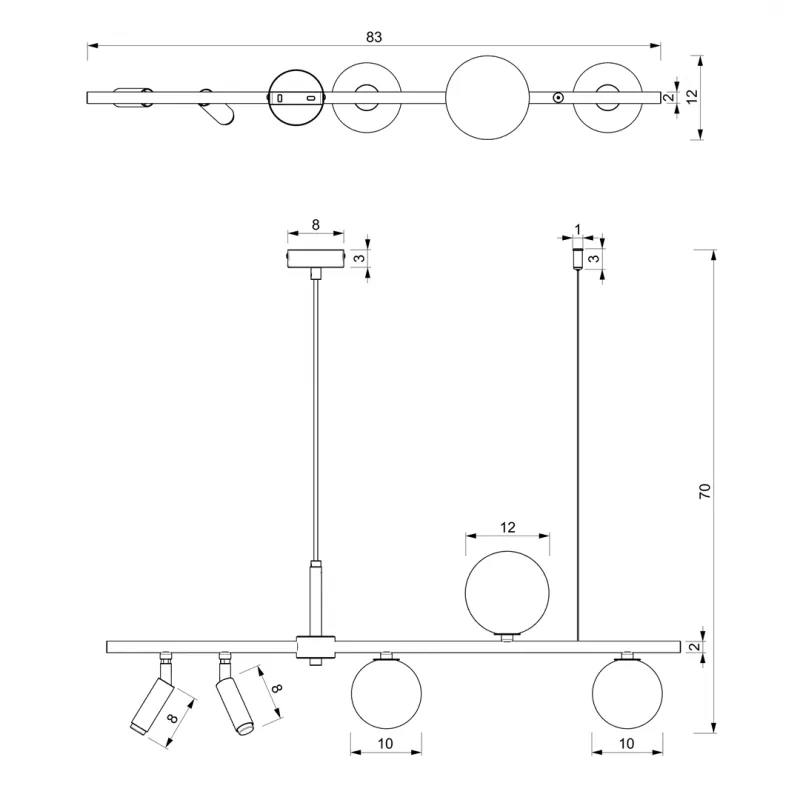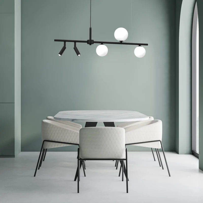 Nietuzinkowa lampa wisząca SIRIO MLP8408 polskiej marki EKO-LIGHT, o wyjątkowej konstrukcji, charakteryzuje się różnymi kloszami. Po jednej stornie umieszczone są 3 szklane kule, natomiast drugą stronę zdobią dwie czarne tuby, to niezwykłe połączenie tworzy niespotykaną kompozycję. Długość belki wynosi 84cm, natomiast regulowana wysokość od 90 do 50 cm, możemy uzyskać poprzez ucięcie przewodu. W lampie należy zamontować 5 żarówek o trzonku G9 do max mocy 25W (brak w zestawie). To oświetlenie jest zdecydowanie dedykowane do odważnych odbiorców. Do kompletu polecamy wybrać inne lampy z serii SIRIO.