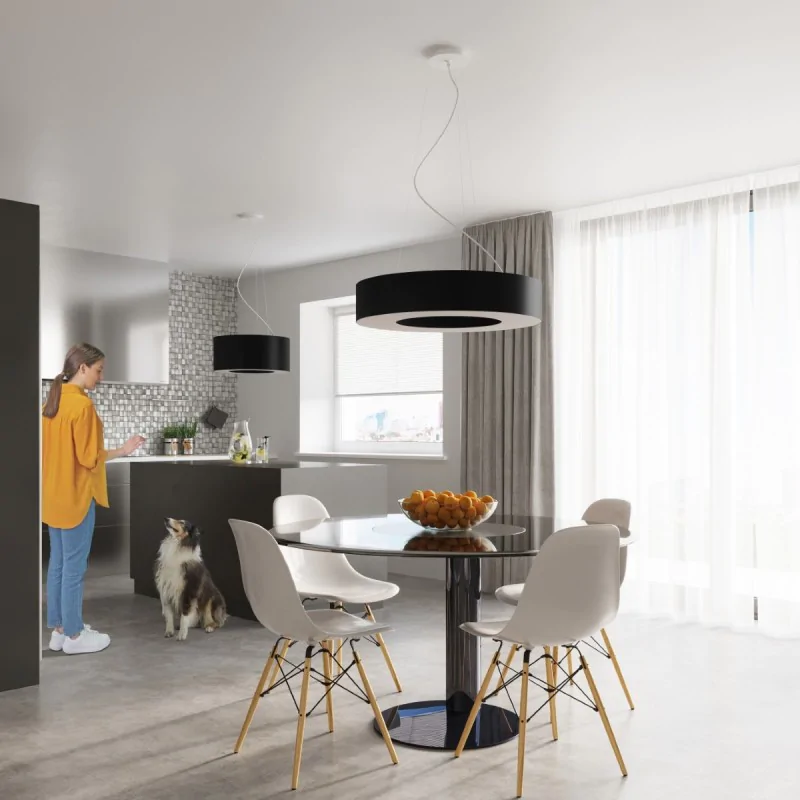 Umieść lampę na dowolnej wysokości w pomieszczeniu. W ten sposób możesz wydzielić przestrzeń roboczą w kuchni czy strefę relaksu w salonie. Wykorzystaj do tego regulowane zawiesie i dopasuj oświetlenie idealnie do swoich potrzeb.