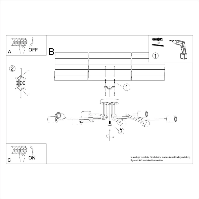 Źródło światła: E27, 8x max 15W LED, ~230V, 50Hz, IP20, klasa ochronności II