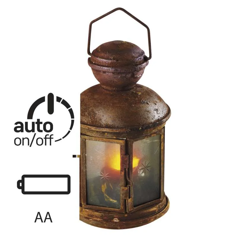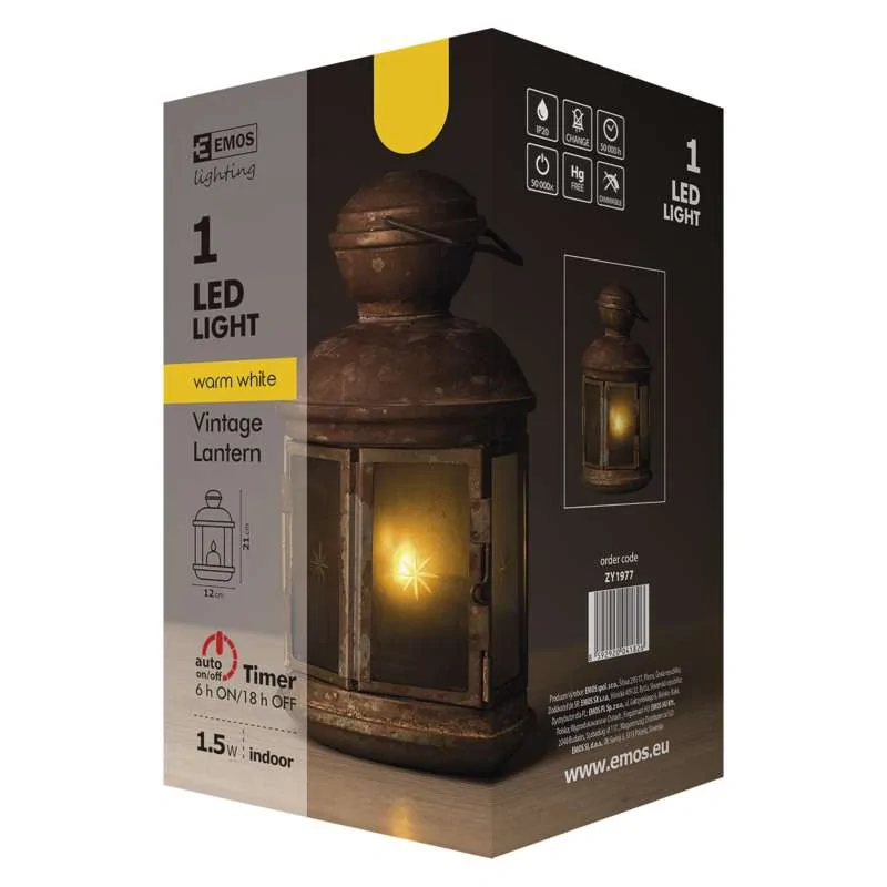 Latarnia LED dekoracyjna ZY1977 firmy EMOS wykonana w starodawnym stylu, dzięki czemu doskonale spisze się jako ozdoba surowych pomieszczeń, ale również nowoczesnych. Produkt posiada timer oraz funkcję przełącznika dwupozycyjnego: OFF- wyłączenie, ON- wyrób po włączeniu świeci w powtarzalnych cyklach codziennie przez 6 godzin, a potem wyłącza się na 18 godzin. Prezentowany model lampionu oddaje przyjemną ciepłą białą barwę światła i zasilany jest trzema bateriami AA (brak w zestawie). Lampion przeznaczony jest tylko do użytku wewnętrznego, a jego przybliżona żywotność to około 50000h.