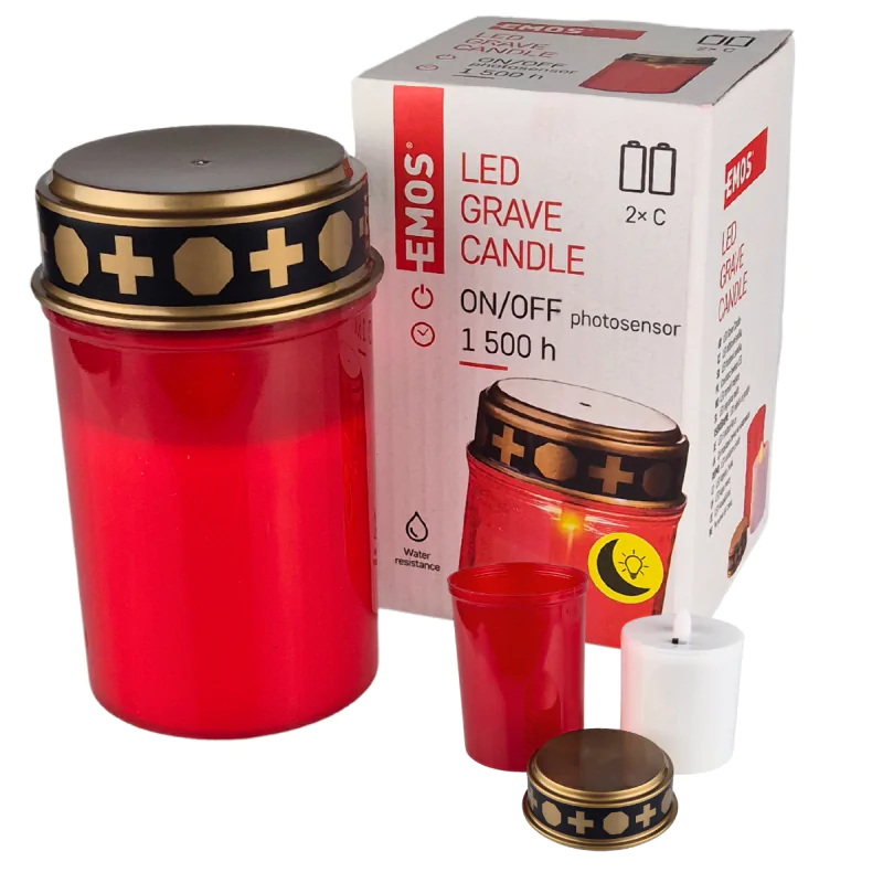 Znicz LED z czujnikiem zmierzchu to nowoczesna propozycja, która łączy elegancki design z funkcjonalnością. Wykonany z trwałego, czerwonego tworzywa sztucznego, idealnie imituje tradycyjne świece cmentarne, jednocześnie oferując długotrwałe i bezobsługowe użytkowanie. Zasilany dwoma bateriami typu C (brak w zestawie), potrafi świecić nawet do 1500 godzin, dzięki czemu zapewnia długotrwałe światło bez potrzeby częstej wymiany baterii.