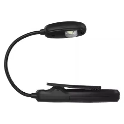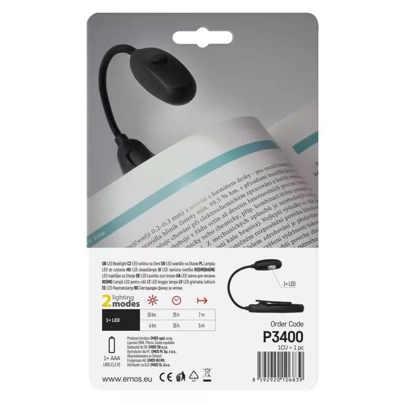 Lampka do czytania marki EMOS to doskonały gadżet dla zwolenników książek. Dzięki ruchomemu trzonkowi czarna lampka do czytania książek pozwala na ustawienie kąta oraz odległości padania światła według preferencji użytkownika. . Jest to lampka do czytania z klipsem, dlatego użytkowanie jej jest jest niezwykle wygodne. Czas świecenia lampki led do czytania sięga nawet 100 godzin. Lampka do czytania książek jest to idealny gadżet dla zwolenników czytania w łóżku. Jeśli chcesz sprawić komuś oryginalny upominek postaw na lampkę do czytania marki Emos. Lampka wymaga 1 baterii AAA- brak w zestawie. Na jednej baterii lampka działa do 35h. Jej waga to zaledwie 30g. Lampę P3400 mocuje się do książki za pomocą wysokiej jakości klipsa i moze działąć w 2 trybach jasności -100 i 50%.
