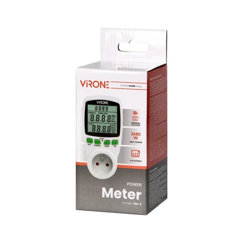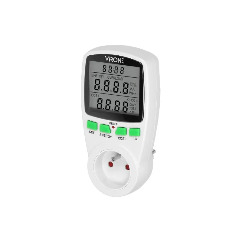 Watomierz firmy ORNO to idealne urządzenie do pomiaru zużycia prądu elektrycznego a przy tym obliczenia kosztów podłączonego urządzenia. Często nie mamy pojęcia jakie urządzenia gospodarstwa domowego pobierają najwięcej energii a tym samym generują największe rachunki. Rozwiązaniem tego problemu jest zakup watomierza który jest w stanie sprawdzić stan zużycia energii zarówno w domu czy też w firmie. Zaletą prezentowanego czarnego kalkulatora energii elektrycznej jest łatwa obsługa oraz duży czytelny wyświetlacz LCD, dzięki czemu urządzenie będzie również doskonałym rozwiązaniem dla osób starszych. Model dostępny również w czarnej wersji. Watomierz obsługuje 1 taryfę. Duży wyświetlacz LCD pokazuje dodatkowo aktualny czas, napięcie i natężenie prądu, współczynnik mocy, częstotliwość, maksymalne obciążenie prądu i ostrzeżenie o przeciążeniu, możliwość wprowadzenia 4 rodzajów waluty. Wewnętrzny akumulator: 2 × 1,5V LR44 podtrzymuje ustawienia urządzenia w razie braku prądu.
