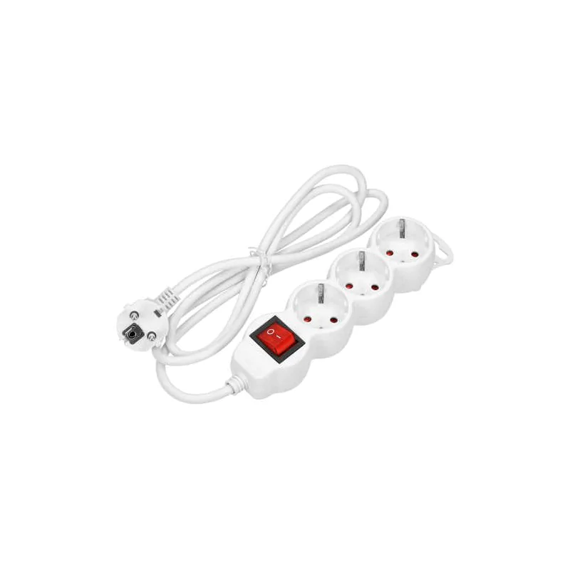 Przedłużacz 3-krotny, to łatwe w użytku i bezpieczne rozwiązanie przeznaczone dla biur i gospodarstw domowych. Produkt w kolorze białym, wyposażony w: 3 gniazda sieciowe 2P+Z typu Schuko, przewód H05VV-F 3x1,5 mm2, o długości 3m, płaską wtyczkę z wygodnym uchwytem, przesłony torów prądowych, podświetlany włącznik dwutorowy, wygodną zawieszkę, jeżeli potrzebujesz np. powiesić listwę na ścianie, izolację PCV.