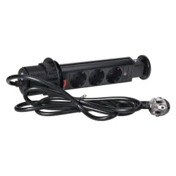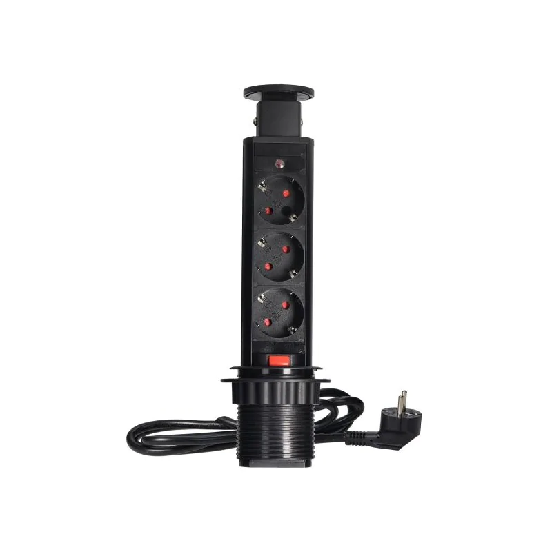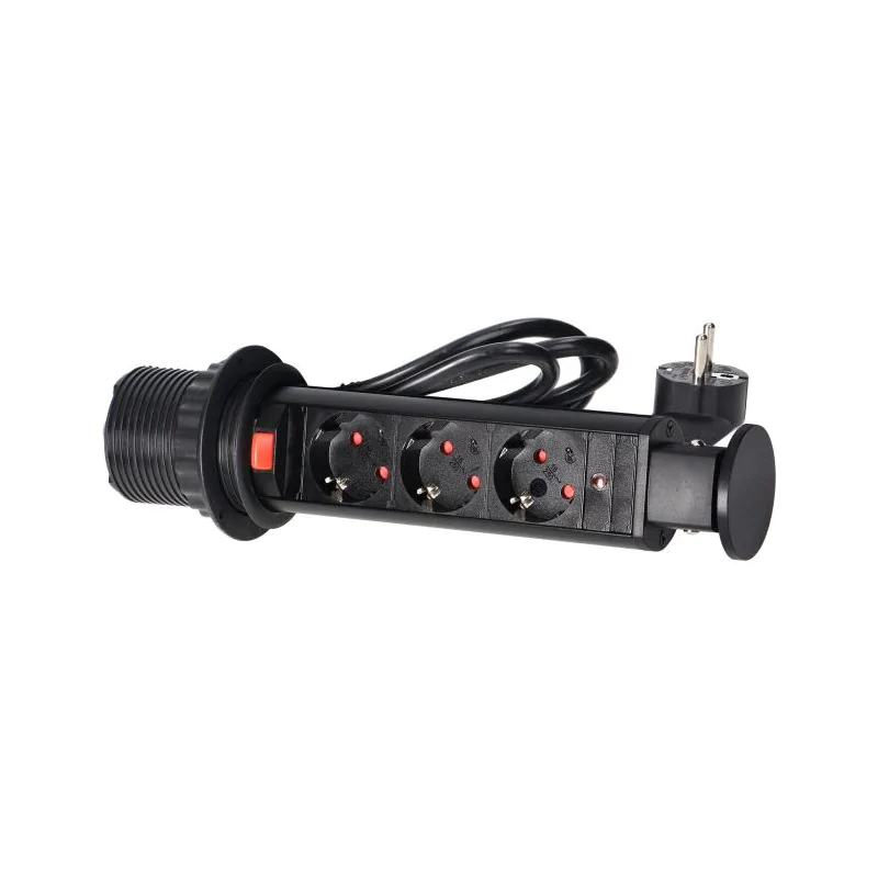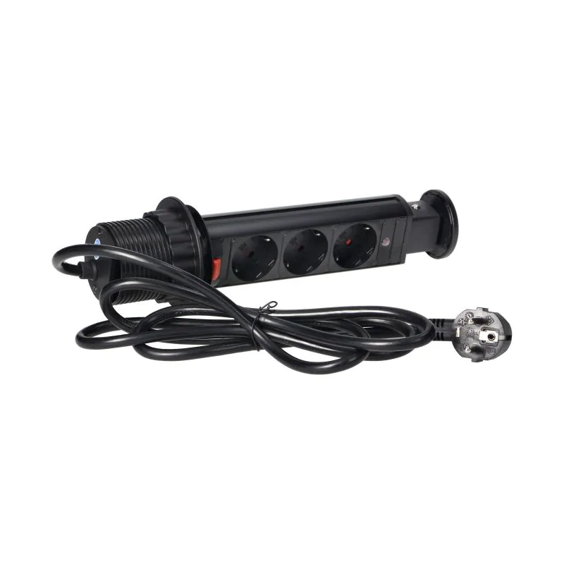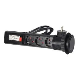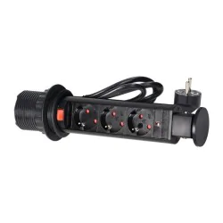 Zestaw trzech gniazd sieciowych z uziemieniem schuko i przesłonami torów prądowych w obudowie chowanej w blat. Urządzenie przeznaczone do montażu w stołach konferencyjnych, blatach mebli biurowych i kuchennych. Posiada wysuwany panel z gniazdami, dodatkową blokadę oraz przewód o długości 1,8 m.