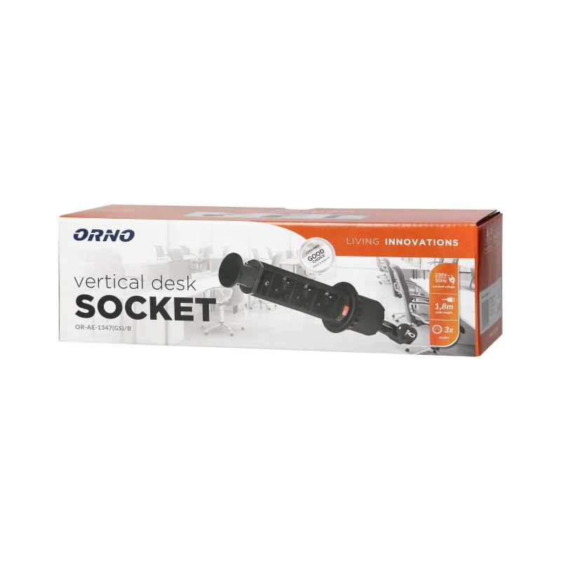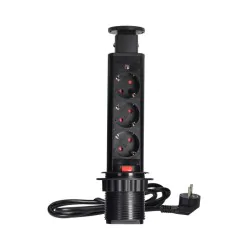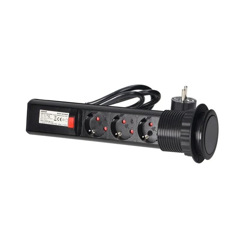 Przedłużacz elektryczny wysuwany z blatu OR-AE-1347(GS)/B w kolorze czarnym firmy ORNO. Gniazdo wysuwane to idealne rozwiązanie do użytku biurowego, w salach konferencyjnych jak i w domu. Przedłużacz umieszczony w blacie biurka lub stołu rozwiązuje problem sięgania do źródła zasilania na ziemie, mając gniazdka zawsze pod ręką w wygodnym miejscu. Urządzenie składa się nieruchomego pierścienia montowanego w blacie z otworem o średnicy 60 mm. Po naciśnięciu przycisku wysuwa się kolumna z trzema gniazdami z uziemieniem typu schuko. Gdy przedłużacz jest schowany komponuje się całkowicie z powierzchnią stołu. Do dyspozycji mamy trzy kontakty do których jednocześnie możemy podłączyć urządzenia o łącznej mocy 3680W. Przedłużacz wpuszczany posiada stopień ochrony IP20.