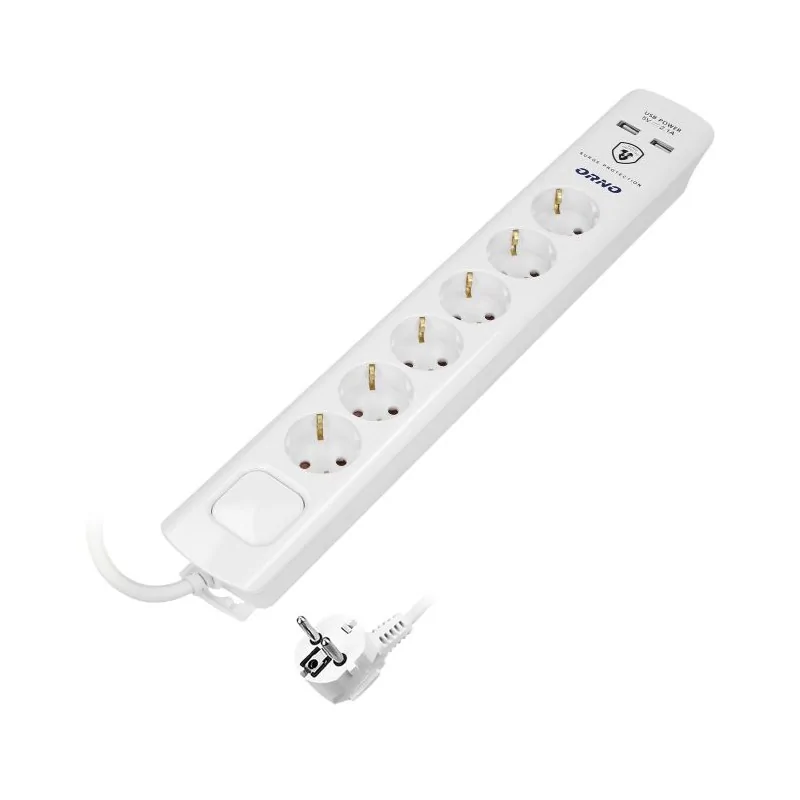 Listwa zasilająca przeciwprzepięciowa marki ORNO wyposażona została w 6 gniazd z uziemieniem i przesłonami torów prądowych. Listwa umożliwia podłączenie 6 urządzeń elektrycznych o łącznym poborze mocy do 2300W. Czarna listwa zasilająca wyposażona została w kabel o długości 3m oraz główny podświetlany wyłącznik dwutorowy. Dodatkowo produkt posiada dwa wejścia USB. Listwa przeciwprzepięciowa skutecznie zabezpieczy Twój sprzęt przed skokami napięcia spowodowanymi warunkami atmosferycznymi lub awariami sieci.