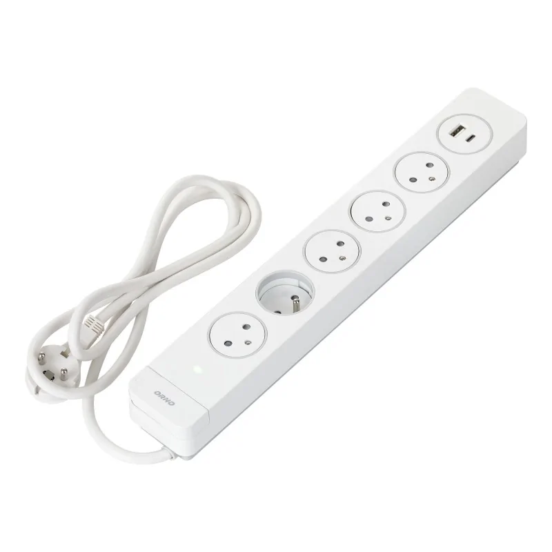 Listwa zasilająca przeciwprzepięciowa marki ORNO wyposażona została w 5 gniazd z uziemieniem i przesłonami torów prądowych. Listwa umożliwia podłączenie 5 urządzeń elektrycznych o łącznym poborze mocy do 3680W. Biała listwa zasilająca wyposażona została w kabel o długości 1,5m oraz system Easy Eject, który ułatwia odłączanie wtyczki- wystarczy nacisnąć wtyczkę w dół, a urządzenie samo odepnie ją od zasilania. Dodatkowo produkt posiada dwa wejścia USB (A i C).