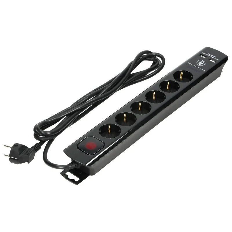 Czarna listwa przeciwprzepięciowa na 6 gniazd schuko z dwoma wejściami USB