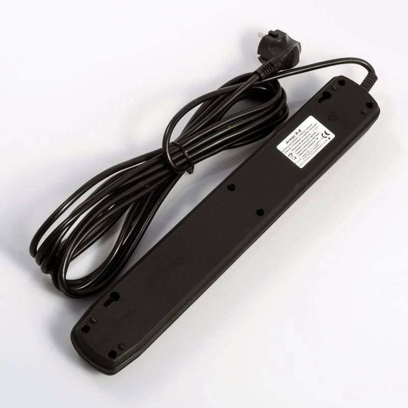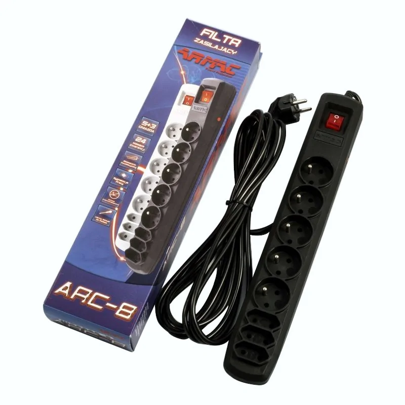 Filtr ARC-8 czarny to ważny element zabezpieczający przed zakłóceniami i przepięciami w sieci zasilającej. Listwa przepięciowa z 8 gniazdami posiada dwustopniowy system zabezpieczający. W listwie znajduje się 5 gniazd ze stykiem ochronnym ( 10A/250V) oraz 3 dodatkowe gniazda płaskie bez styku ochronnego (2,5A/250V). Listwa jest bardzo prosta w obsłudze i bardzo skuteczna w działaniu, posiada bezpiecznik automatyczny. Listwa zasilająca posiada sygnalizację pracy oraz bezpieczną, nieprzewodzącą, samogasnącą czarną obudowę. W przypadku przeciążenia listwy, przywrócenie do ponownej pracy ogranicza się tylko do włączenia bezpiecznika. Przedłużacz przepięciowy posiada przewód o długości 5 m, który pozwala na swobodne ułożenie listwy w dowolnym miejscu. Przedłużacz z bezpiecznikiem możesz zastosować w komputerach, kasach fiskalnych, kserokopiarkach czy sprzęcie RTV.