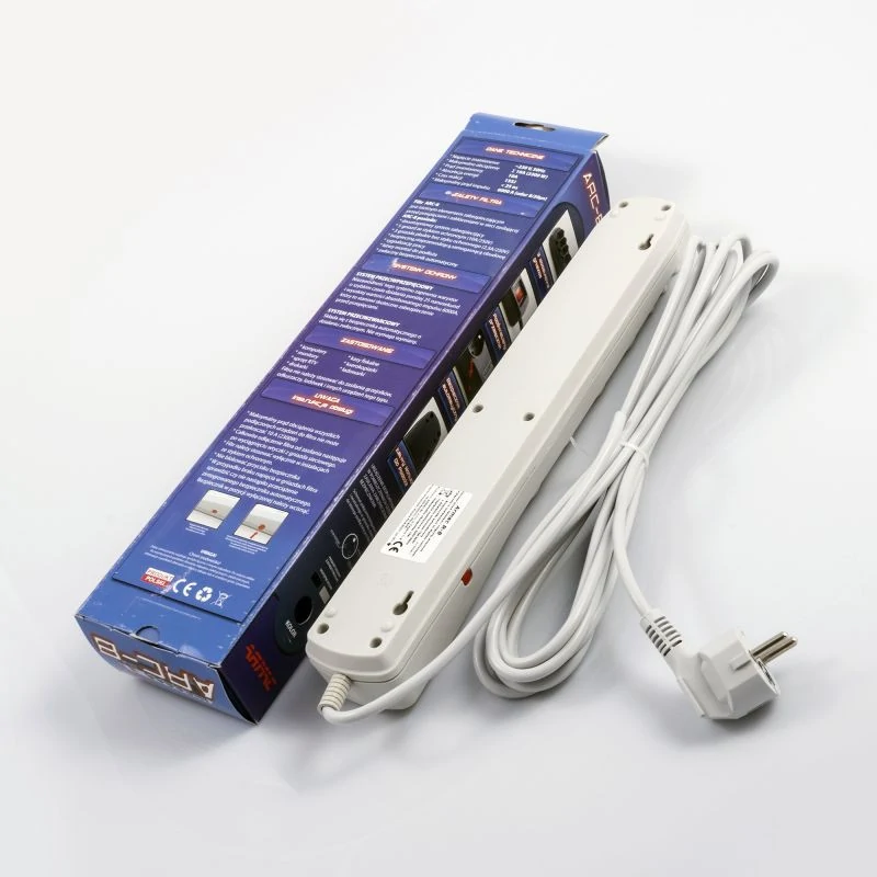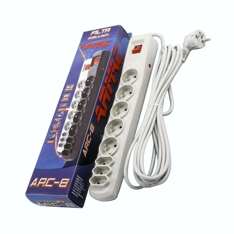 Filtr ARC-8 szary to element zasilający chroniący przed przepięciami i zakłóceniami w sieci zasilającej. Model ARC-8 posiada 5 gniazd z uziemieniem oraz 3 gniazda na płaskie wtyczki, czyli w sumie można podłączyć do tego modelu osiem różnych sprzętów. Model gwarantuje bezpieczne użytkowanie podpiętych do niego sprzętów, ponieważ posiada system przeciwprzepięciowy i przeciwzwarciowy. W listwie elektrycznej znajduje się 5 gniazd ze stykiem ochronnym ( 10A/250V) oraz 3 dodatkowe gniazda płaskie bez styku ochronnego (2,5A/250V). Towar posiada bezpieczną, nieprzewodzącą, samogasnącą obudowę oraz możliwość łatwego przytwierdzenia do podłoża. Listwa z zabezpieczeniem posiada 5 metrowy przewód zasilający, ułatwiający zorganizowanie miejsca pracy w biurze i funkcjonalne podłączenie różnych sprzętów. Listwa przeciwprzepięciowa posiada bezpiecznik automatyczny zwłoczny, którego nie trzeba wymieniać. Listwa zasilająca posiada sygnalizację pracy. Model zabezpiecza przed spaleniem urządzeń, gdy w pobliżu uderzy piorun oraz przed skokami napięcia, szumami wysokiej częstotliwości, zwarciami i przeciążeniami.