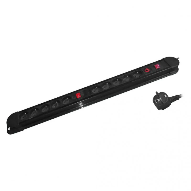Czarna listwa zasilająca na 10 gniazda z dwoma włącznikami- dwutorowym i termicznym