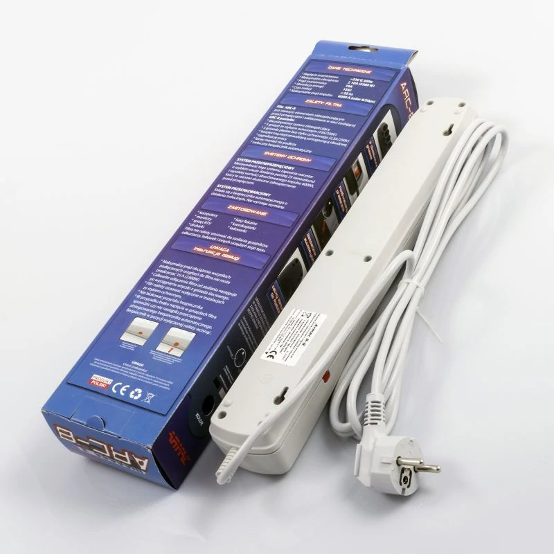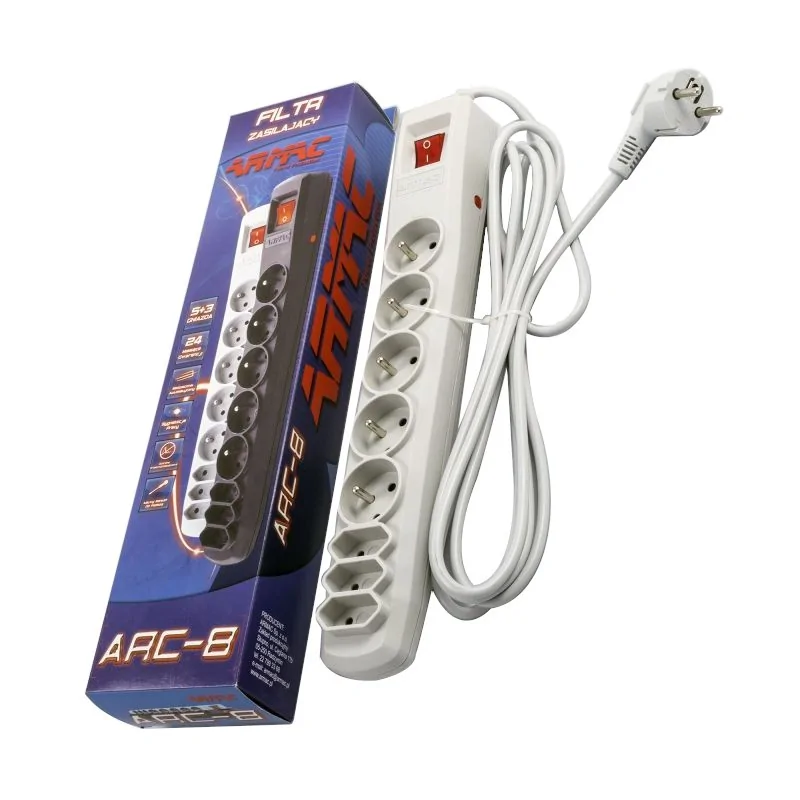 Filtr ARC-8 szary z 3 metrowym przewodem zasilającym to urządzenie, które pomoże zminimalizować Ci ryzyko następstw skoków napięcia. Listwa zasilając ARC-8 to funkcjonalna propozycja z 8 gniazdami, 5 z nich to gniazda z uziemieniem, a pozostałe 3 to gniazda płaskie bez uziemienia. Nowoczesny, automatyczny bezpiecznik o działaniu zwłocznym, skutecznie zabezpiecza i nie wymaga wymiany, gwarantując ochronę przed zwarciami i przepięciami. ARC-8 posiada szarą obudowę wykonaną z samogasnącego odpornego tworzywa. Prosty montaż i intuicyjna obsługa listwy zabezpieczająco-zasilającej możliwe są między innymi: dzięki widocznej sygnalizacji pracy i łatwości przytwierdzenia do podłoża. Z taką listwą możesz bezpiecznie podpiąć komputery, drukarki, skanery, telewizory czy inne sprzęty pracujące pod napięciem, chroniąc je np. przed skutkami wyładowań atmosferycznych podczas burzy lub innych awarii w sieci prądowej. Taka listwa zasilająca z bezpiecznikami powinna znaleźć się w każdym biurze czy domu.