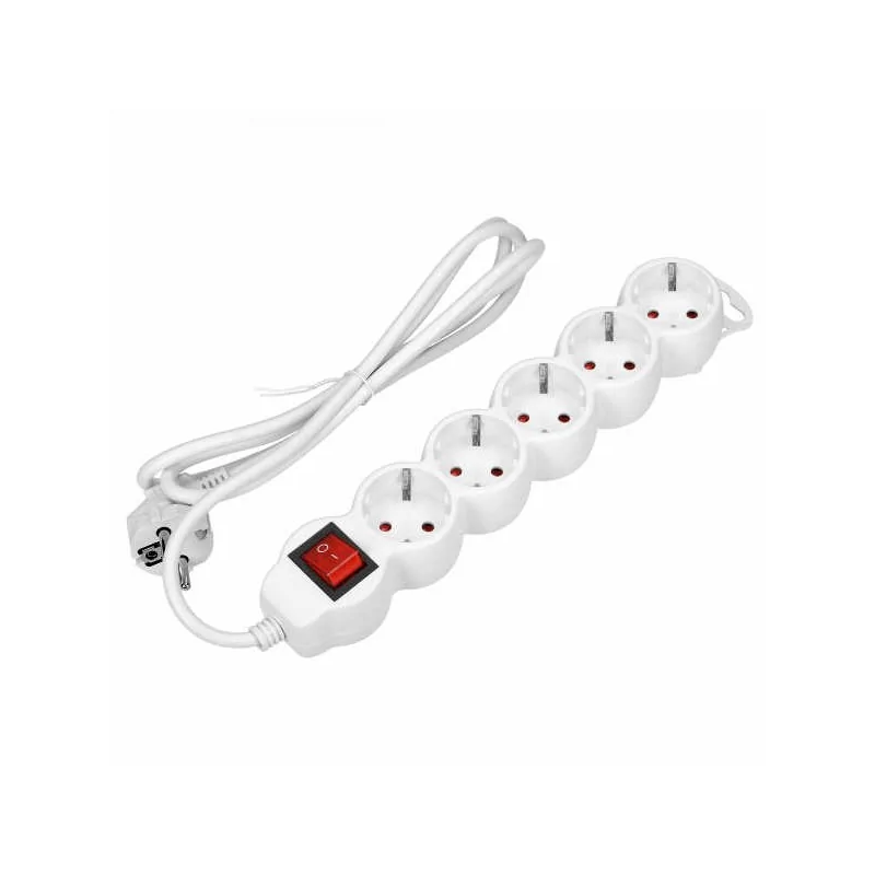 Klasyczny domowy przedłużacz w kolorze białym OR-AE-13150(GS)/W/5M marki ORNO wyposażony został w 5 gniazd z uziemieniem w wersji Schuko i przesłonami torów prądowych. Do listwy można podłączyć 5 urządzeń o maksymalnym obciążeniu do 2300W. Długość przewodu przedłużacza wynosi 5m. Produkt przeznaczony do zastosowania wewnętrznego- IP20.