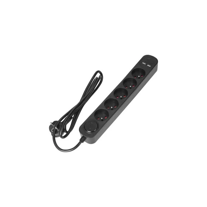 Czarny przedłużacz na 5 gniazd z płaską wtyczką z dwoma wejściami USB