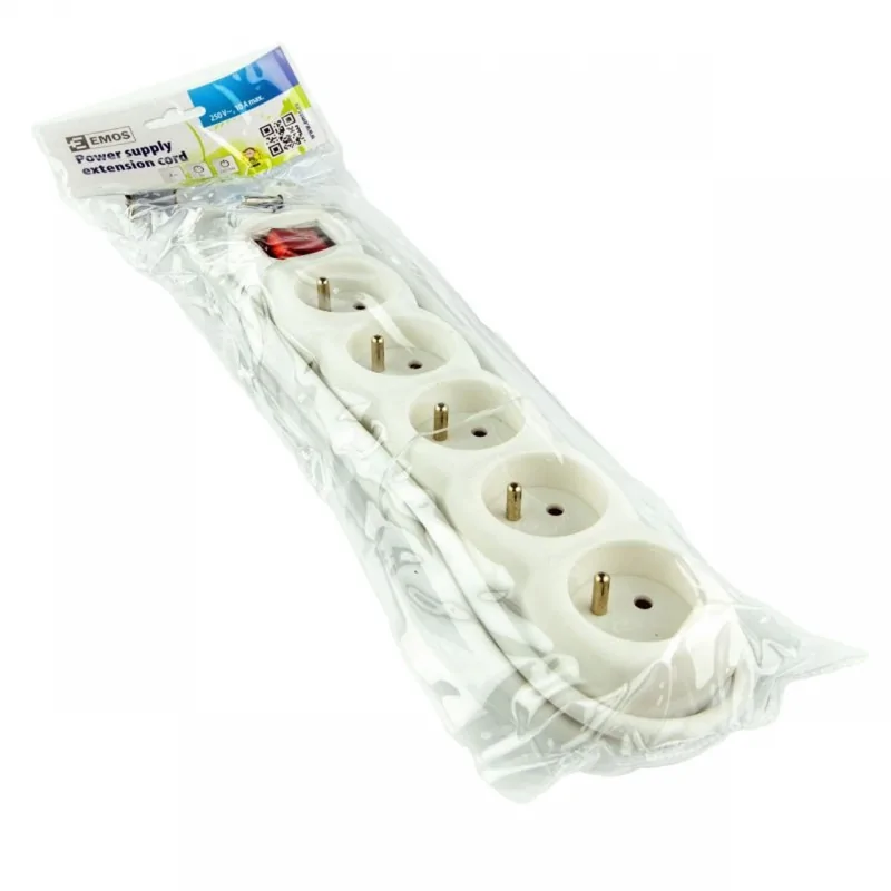 Przedłużacz z wyłącznikiem marki EMOS w kolorze białym wyposażony jest w pięć gniazd zawierających uziemienia oraz przesłony torów prądowych. Listwa zasilająca posiada dwumetrowy kabel zakończony okrągłą wtyczką z uziemieniem. Przedłużacz P1512 jest bezpieczny w użytkowaniu, nie tylko ze względu na przesłony chroniące ciekawskie dzieci przed porażeniem prądem. Każda listwa zasilająca chroni urządzenia elektryczne przed 'spaleniem' w wyniku występowania skoków napięcia, automatycznie odcinając zasilanie