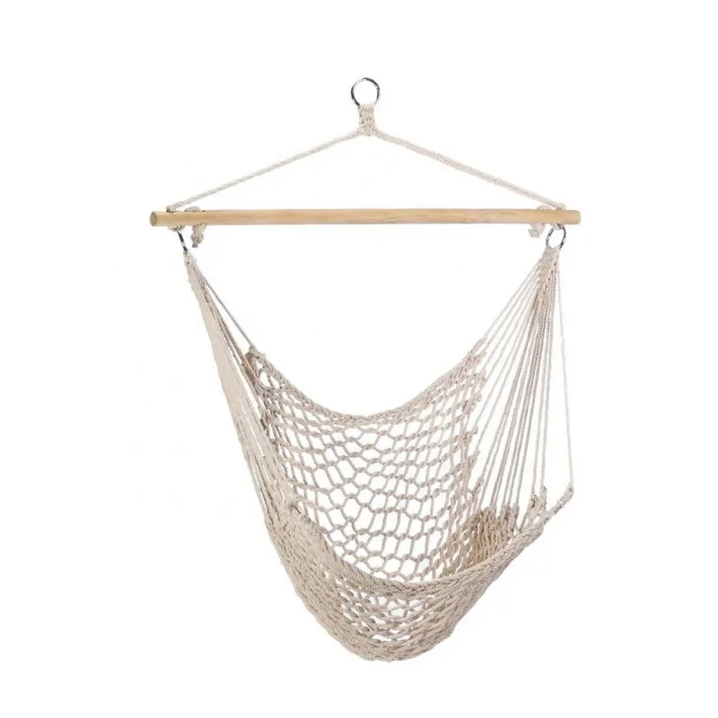 Krzesło brazylijskie to modny akcent, który warto posiadać w swoim ogrodzie. Fotel wiszący KUBA w kolorze ECRU będzie prawdziwą ozdobą tarasu czy salonu. Krzesło wykonane jest w modnej stylistyce boho z naturalnego drewna i ażurowego kremowego materialu. Drewniany pręt o długości ok 100 cm utrzymuje całą konstrukcję wiszącego fotelu ogrodowego. Wymiary siedziska krzesła to 100x90cm. Model dostępny również w innych wariantach kolorystycznych. Wiszące krzesło huśtawka w stylu BOHO to świetny prezent na parapetówkę czy inną okazję. Relaks na fotelu uprzyjemni letnie dni na działce.