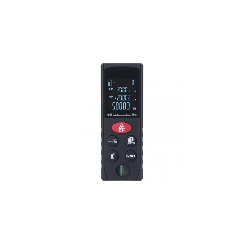 Laserowy miernik odległości to sprytne urządzenie, którę będzie pomocnikiem zarówno dla majsterkowiczów, jak i profesjonalistów. Miernik odległości M0502 pomoże szybko zmierzyć każde pomieszczenie, łącznie ze zmierzeniem powierzchni i kubatury. Dokładność pomiaru w urządzeniu to +/- 2 mm. Produkt objęty jest gwarancją producenta. Produkt został wyposażony w podświetlany wyświetlacz, któy wyświetla wyniki w następujących jednostkach:m, ft, in, m², ft², m³, ft³. Laserowy miernik długości działa w zakresie od 0,05 do 40m. Produkt zasilany 2 bateriami AAA- brak w zestawie. Funkcje pomiarowe miernika długości to : długość, powierzchnia, objętość, pomiar ciągły, trójkąt Pitagorasa.