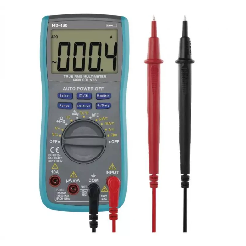 Zaawansowany multimetr M0430 przeznaczony jest do celów profesjonalnych oraz do użytkowania przez hobbystów. Można go wykorzystać do zarówno przy konserwacji urządzeń elektrycznych, jak i wykonywaniu nowych instalacji elektrycznych. Przyrząd oferuje wszystkie standardowe funkcje pomiarów za pośrednictwem grotów, umożliwia zarejestrowanie pomiarów w celu przeprowadzenia ich oceny oraz zapewnia wiele innych zaawansowanych funkcji . Duży zakres pomiarów prądu i napięcia AC/DC sprawia, że ten multimetr jest prawdziwie uniwersalnym narzędziem. Dzięki funkcji True RMS, przyrząd umożliwia dokładny pomiar wartości dowolnych przemiennych sygnałów niesinusoidalnych natężenia i napięcia. Ponadto, podczas ustawiania zakresu pomiarów pozwala skorzystać z ręcznego lub automatycznego sposobu wyboru zakresu. Dodatkowo multimetr posiada podświetlany wyświetlacz, sygnalizację akustyczną. Największą zaletą tego multimetru są funkcje zaawansowane – pomiar ciągłości obwodu, test diod i tranzystorów, a także pomiar temperatury w zakresie -40 °C do +300 °C dzięki dostarczanej w ramach standardowego wyposażenia sondzie temperaturowej typu K .Funkcja data hold służy do rejestracji wyświetlanych aktualnych wyników pomiarów w celu ich późniejszej oceny. Multimetr rejestruje maksymalne i minimalne zmierzone wartości. Dzięki taśmie do zawieszania z magnesem można przyrząd przymocować do dowolnego metalowego podłoża i mieć go stale pod ręką. Zestaw zawiera: groty pomiarowe, redukcję do pomiarów tranzystorów, sondę temperaturową typu K i baterię 9 V.