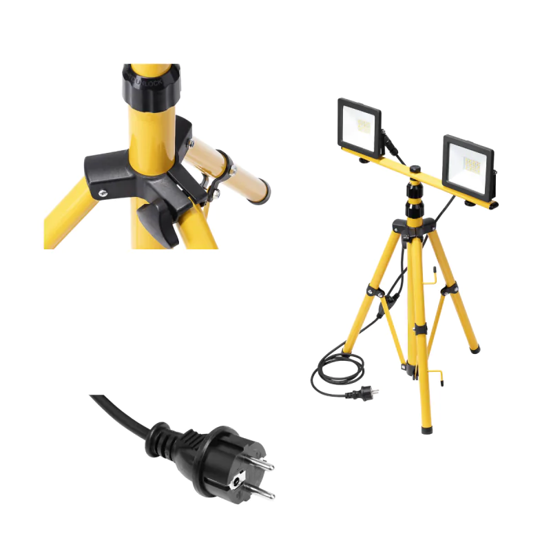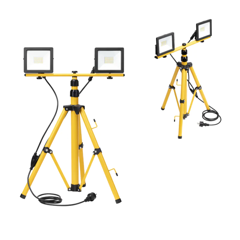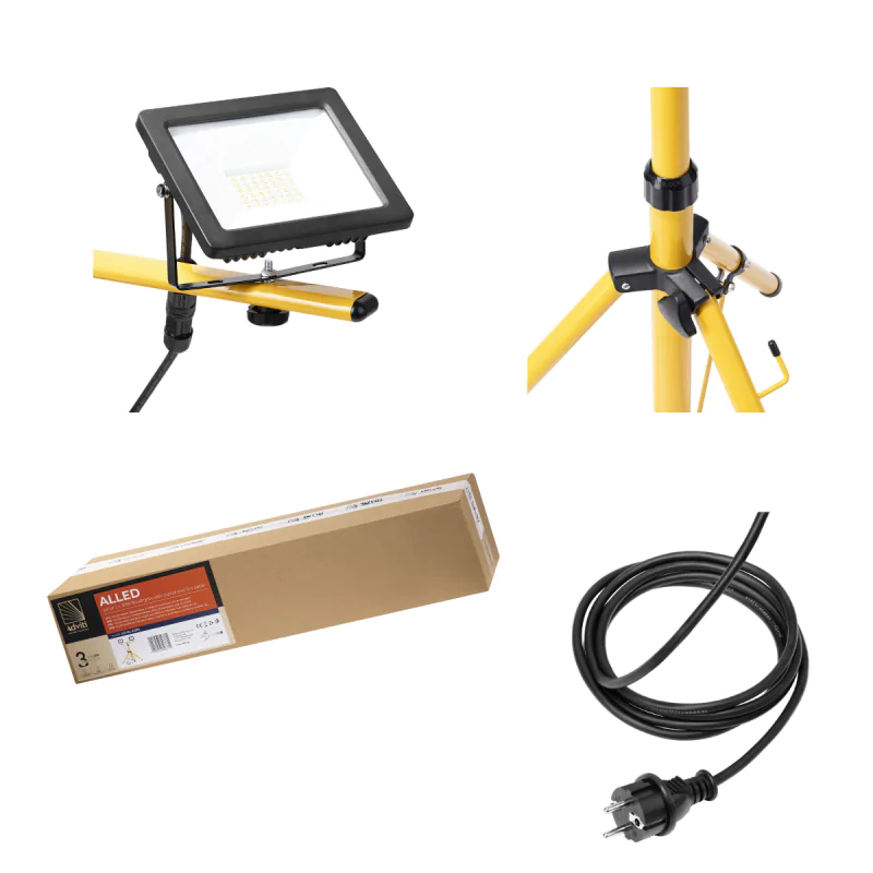 Dwa naświetlacze LED ALLED w komplecie z regulowanym, teleskopowym statywem marki ORNO przeznaczone są do zastosowania wewnątrz np. w garażach, na halach czy budowach, jak również na zewnątrz. Statyw posiada możliwość regulacji wysokości do max. 150cm. Halogeny LED działają z mocą 30W (2x30W) i wyposażone zostały w 2-metrowy przewód o przekroju 3x1m2. Lampy świecą neutralnym, dziennym światłem o temperaturze barwowej 4000K i strumieniem świetlnym 2x2700 lumenów. Dostępna jest również wersja 2x50W.
