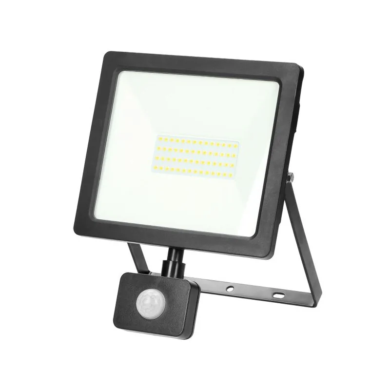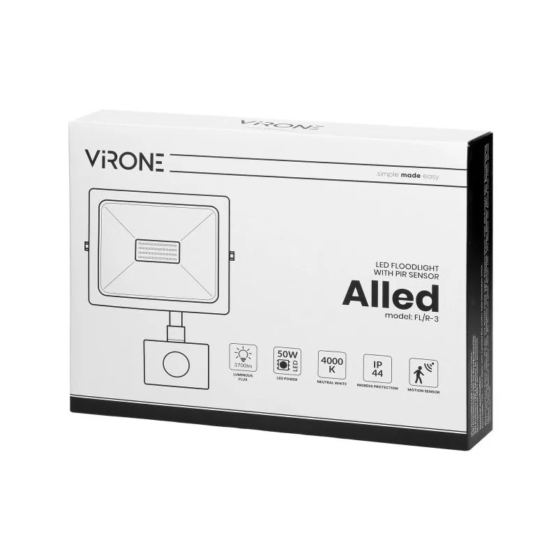 Naświetlacz z linii ALLED marki ORNO, w kolorze czarnym, posiada strumień świetlny równy 3700lm. Przeznaczony jest do stosowania w gospodarstwach domowych oraz do użytku wewnątrz (garaże, hale), jak i na zewnątrz pomieszczeń jako oświetlenie parkingowe, ogrodowe, posesji, fasad, reklam, itp. Oświetlenie zewnętrzne, wyposażone jest w diody LED SMD oraz czujnik PIR, który reaguje na ruch. Ze względu na wysoki stopień szczelności IP44 naświetlacz może być instalowany w pomieszczeniach o podwyższonej wilgotności. Lampa świeci mocnym światłom równy 50W o neutralnej barwie (4000K).