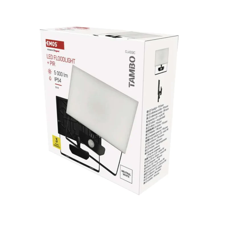 Hermetyczny naświetlacz led w czarnej obudowie TAMBO marki EMOS to doskonałe oświetlenie posesji, wjazdu czy np. restauracji. Wysoka klasa szczelności IP54 sprawia, że lampa może pracować w trudnych warunkach zewnętrznych w zakresie temperaturowym -20 °C do +40 °C. Naświetlacz led działa z mocą 50W, Dodatkowo wyposażony jest w czujnik ruchu. którego zasięg 10m. Naświetlacz led świeci neutralnym białym światłem o temperaturze barwowej 4000K i strumieniem świetlnym równym 4000 lumenów. Przybliżony czas działania energooszczędnego źródła światła to około 25000h. Wymiary produktu to: 210 × 217 × 64 mm.