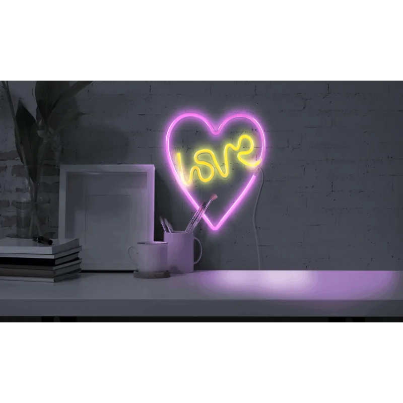 Dekoracyjna neonowa lampka led marki POLUX-GOLDLUX w kształcie serca z napisem love to świetna ozdoba do pokoju. Neon LED świeci różowym światłem z żółtym napisem. Świecąca neonowa dekoracja led zasilana jest trzema bateriami AA (brak w zestawie) oraz poprzez USB typu A. Produkt oddaje światło z mocą 3W i posiada wyłącznik on/off przy zasilaniu bateryjnym. Wymiary lampki neonowej led to 25,5x1,5x27 cm. Stopień szczelności neonowej ozdoby to IP20.
