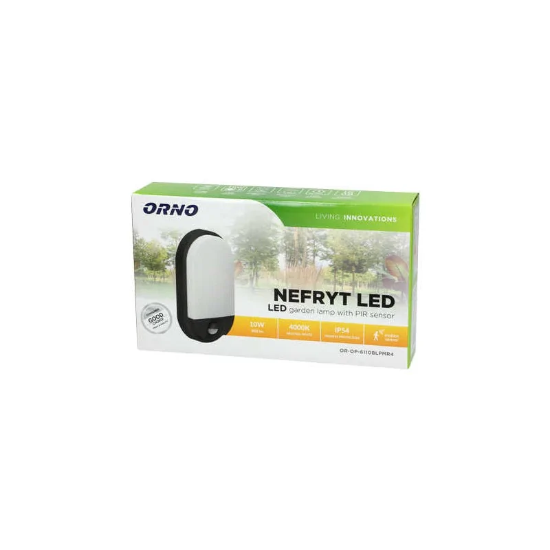 Oprawa ogrodowa led serii Nefryt marki ORNO działa z mocą 10W i wyposażona została w czujnik ruchu, którego zasięg detekcji wynosi 9m. Ze względu na wysoki stopień ochronności IP54 lampa może być stosowana na zewnątrz i jest odporna na wilgoć oraz pył. Oprawa ogrodowa led z czujnikiem ruchu posiada czarną obudowę, która dopasuje się do każdego otoczenia. Neutralna barwa światła o temperautrze barwowej 4000K rozjaśni każdy ogród. Produkt idealnie nada się na elewacjach budynków czy betonowych ogrodzeniach. Oprawa dostępna jest również w wersji o większej mocy i w białym kolorze.