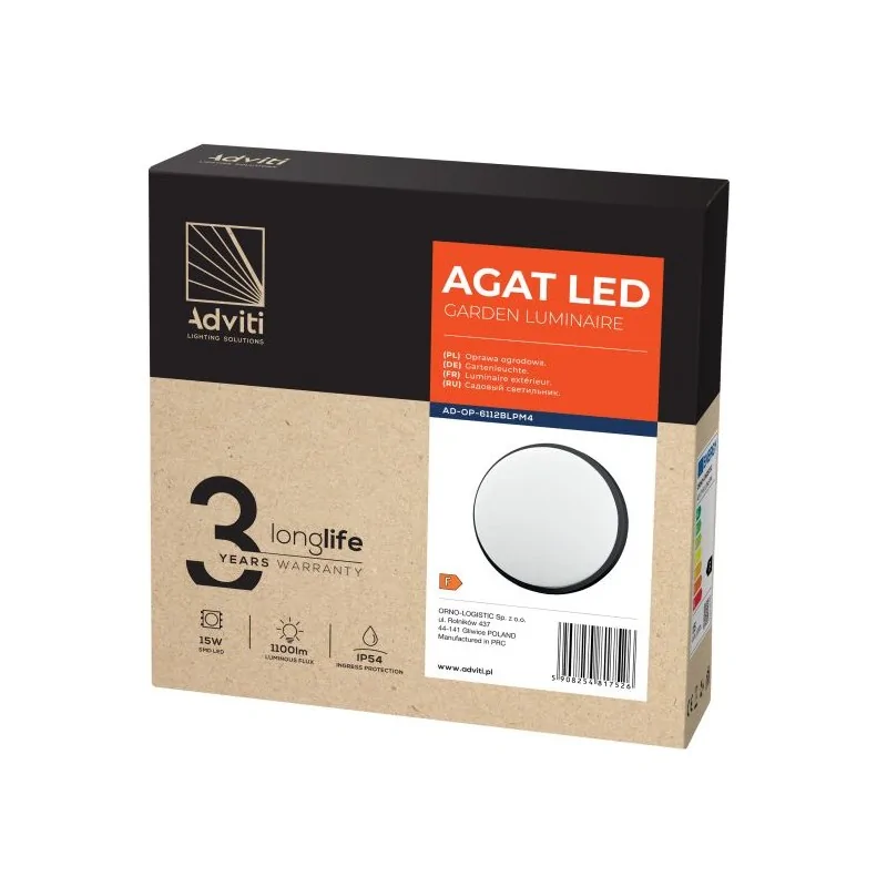 Plafon ogrodowy led AGAT idealnie nada się jako oświetlenie elewacyjne czy ogrodowe. Wysoki stopień odporności IP54 pozwala na zastosowanie lampy na zewnątrz, w zakresie temperaturowym - 20 ~ 40°C. Czarna okrągła lampa hermetyczna led działa z mocą 15W i świeci dziennym, neutralnym białym światłem o temperaturze barwowej 4000K i strumieniu świetlnym równym 1100 lumenów. Przybliżony czas żywotności zintegrowanych, niewymiennych diod led to około 50000h oraz 100000 cykli włączeń i wyłączeń. Wymiary plafonu to: Ø210 x 49mm.