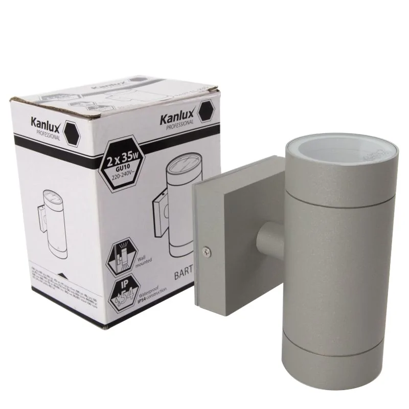 Szara oprawa elewacyjna BART EL-235 firmy KANLUX, przeznaczona do montażu na elewacji budynku. Masywna oprawa w kształcie tuby, wykonana z aluminium. Posiada dwa gniazda na źródła światła z trzonkiem GU10 ( halogen lub LED) o mocy pojedynczej żarówki nie przekraczającej 35 W. Oprawa BART EL-235 stworzy doskonały efekt oświetleniowy wejść do budynków, podkreślając elementy architektoniczne, z dołu i góry. Oprawa ścienna posiada stopień ochrony IP54, oznacza to, że jest odporna na niekorzystne warunki atmosferyczne, w tym bezpośredni kontakt ze strumieniem wody.