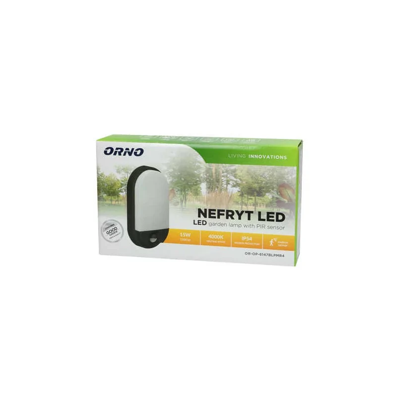 Klasyczna oprawa ogrodowa NEFRYT firmy ORNO wyposażona została w zintegrowane światło led, co charakteryzuje się energooszczędnością oraz długą trwałością. Czarny kolor obudowy wkomponuje się w każde otoczenie, a klasyczny kształt oprawy nada ciekawego stylu. Produkt świeci dzienną, neutralną barwą światła o temperaturze barwowej 4000K i strumieniu świetlnym 1100 lumenów. Ze względu na wysoki stopień ochrony IP54 oprawa odporna jest na wnikanie pyłu i wilgoci. Dodatkowo lampa led na zewnątrz wyposażona jest w czujnik ruchu, którego zasięg detekcji to 9m. Czujnik ruchu reaguje w chwili pojawienia się ruchu w polu detekcji, a czujnik zmierzchowy załącza oświetlenie wtedy, gdy jest taka potrzeba (w zależności od ustawień).