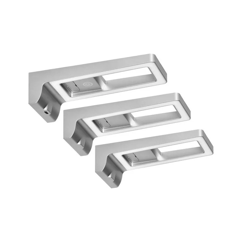 Zestaw trzech lampek meblowych marki ORNO w kolorze szarym. Lampki podszafkowe świetnie nadają się do podświetlenia blatów kuchennych oraz innych zakamarków. Jedna z trzech lampek wyposażona została w wyłącznik dotykowy, który steruje całym zestawem oraz reguluje jasność światła. Oświetlenie meblowe emituje neutralnym światłem o temperaturze barwowej 4000K, mocy 4W i strumieniem światła 225lm każda. Zasilacz został dołączony do zestawu. Istnieje możliwość rozbudowania zestawu o kolejne lampki z tej samej serii ARTUS.