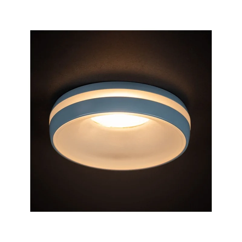 Okrągła oprawa sufitowa do wbudowania ELICEO marki Kanlux wykonana została ze stopu aluminium w dekoracyjnym błękitnym kolorze. To doskonałe oświetlenie do kuchni i salonu wykonanych w nowoczesnym stylu. Wymienne źródło światła pozwalana na samodzielny dobór barwy oraz mocy żarówki GU10 do maksymalnej wartości 10W (lub Gx5,3). Rozwiązanie to pozwala na doskonałe dopasowanie oświetlenia pod dedykowane wnętrze przeznaczenia. Do pierścieni sam dobierzesz oprawkę, co pozwoli Ci dostosować Kanlux ELICEO do Twojej instalacji (12V lub 230V). Kanlux ELICEO to pierścienie ozdobne (oczka) z nietypowym efektem świecenia. Oprócz głównego źródła światła posiadają także dwa świecące pierścienie w obudowie, co daje niepowtarzalny efekt dekoracyjny. Dostępne są w kilku wersjach kolorystycznych: białej, czarnej i biało-złotej, a także różowej, zielonej i niebieskiej. Ten model świetnie sprawdzi się np. w pokoju chłopca, przedszkolach czy salach zabaw.